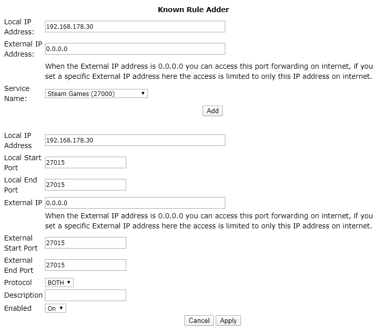 3. Type your IPv4 address and the game port: 27015, both UDP and TCP