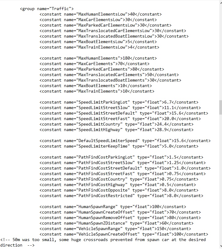 <group name=”Traffic”> <constant name=”MaxHumanElementsLow”>20</constant> <constant name=”MaxCarElementsLow”>20</constant> <constant name=”MaxParkedCarElementsLow”>20</constant> <constant name=”MaxTranslocatedCarElementsLow”>20</constant> <constant name=”MaxTranslocatedBoatElementsLow”>20</constant> <constant name=”MaxBoatElementsLow”>3</constant> <constant name=”MaxTrainElementsLow”>2</constant> <constant name=”MaxHumanElements”>150</constant> <constant name=”MaxCarElements”>40</constant> <constant name=”MaxParkedCarElements”>50</constant> <constant name=”MaxTranslocatedCarElements”>50</constant> <constant name=”MaxTranslocatedBoatElements”>20</constant> <constant name=”MaxBoatElements”>10</constant> <constant name=”MaxTrainElements”>5</constant> <constant name=”HumanSpawnRange” type=”float”>70</constant> <constant name=”HumanSpawnCreateOffset” type=”float”>50</constant> <constant name=”HumanSpawnRemoveOffset” type=”float”>60</constant> <constant name=”HumanSpawnZDistance” type=”float”>30</constant> <constant name=”VehicleSpawnRange” type=”float”>110</constant> <constant name=”VehicleSpawnCreateOffset” type=”float”>80</constant> <!– 50m was too small, some huge crossroads prevented from spawn car at the desired direction –> <constant name=”VehicleSpawnRemoveOffset” type=”float”>110</constant>